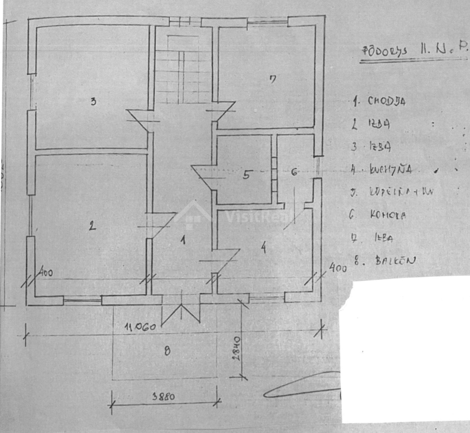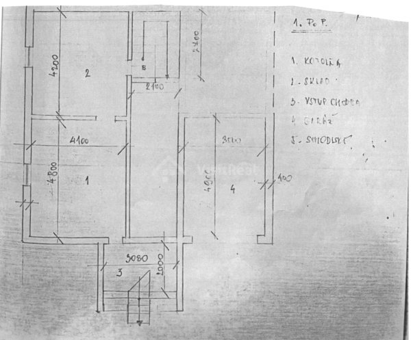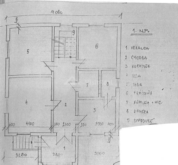 1.NP: veranda, chodba, kuchyňa + komora,3 izby, kúpeľňa + WC, schodisko