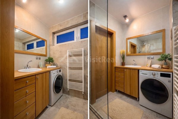 Celý byt pôsobí harmonicky a moderne, pričom každý detail bol premyslený tak, aby spájal estetiku s dlhou životnosťou. V kúpeľni a toalete nájdete kvalitné obklady a dlažby, walk-in sprchovací kút so sklenenou stenou a drevenú kúpeľňovú skrinku, ktorá podčiarkuje celkový štýl priestoru.